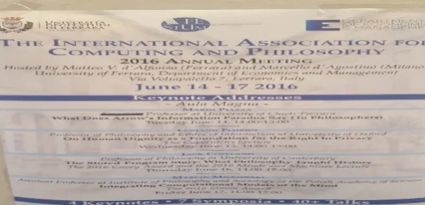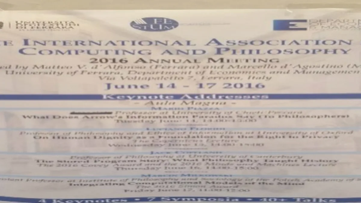 A cura di Unife (Università di Ferrara), Department of Economycs and Management, Dipartimento di Studi Umanistici, a Ferrara, dal 14 al 17 giungo, si svolge ”The International Association for Computing and Philosophy”, convegno di rara altitudine ciberculturale. Tre giorni con interventi e dibattiti in programma sui lavori in corso d'avanguardia e di frontiera delle cosiddette computer science, tra informatica, intelligenza artificiale, robotica, neuroscienze.