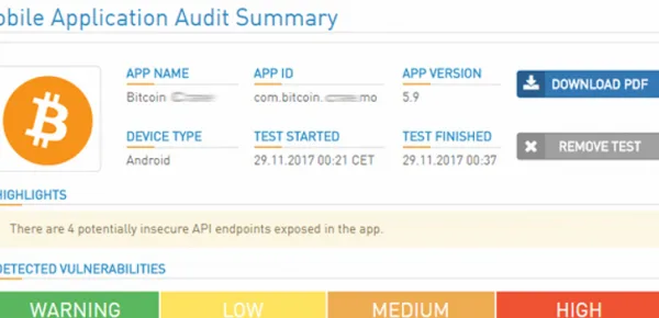 High-Tech Bridge ha condotto l'analisi tramite la sua app gratuita di analisi, chiamata Mobile X-Ray, con la quale sono state analizzate 90 app Android per criptovalute di cui 30 che hanno raggiunto fino a 100000 download, altre 30 con un numero di download fino a 500000 download e le restanti 30 con un numero di download superiore a 500000.