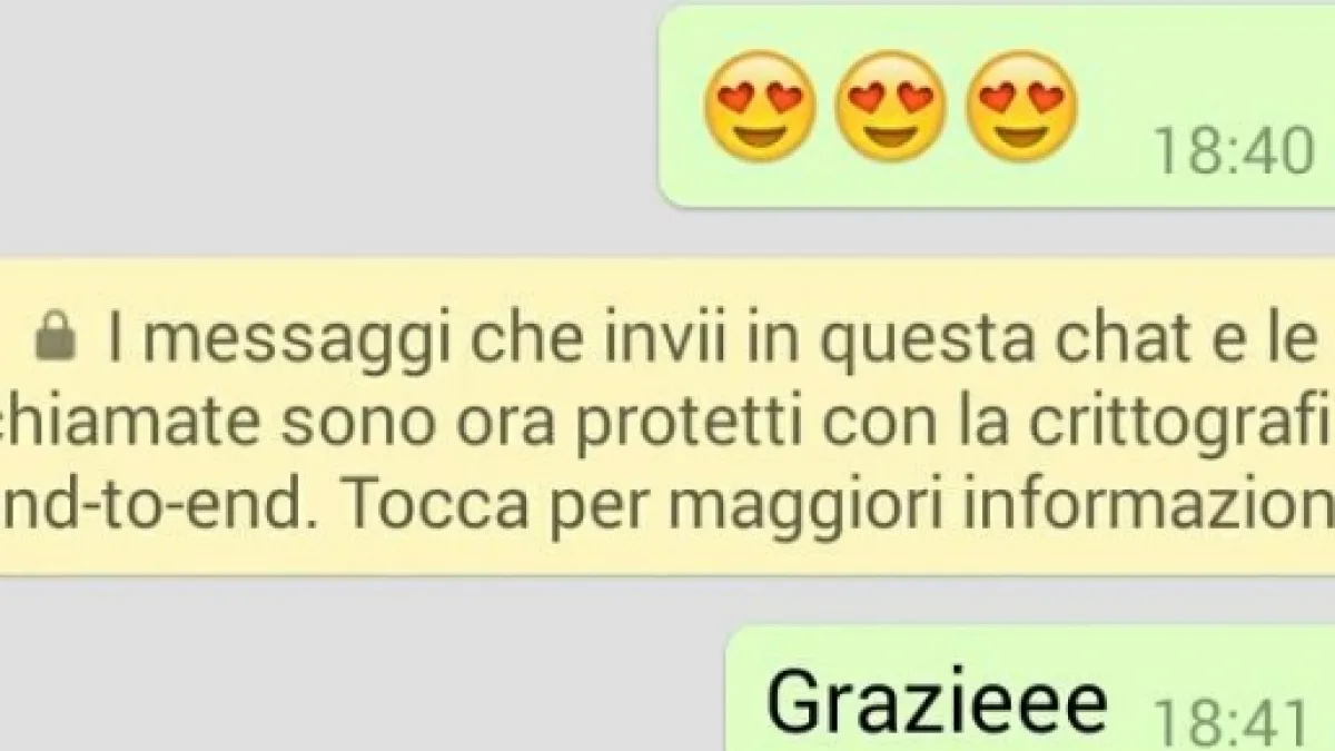 Il messaggio apparso su ogni chat di WhatsApp è: (lucchetto nero) 'I messaggi che invii in questa chat e le chiamate sono ora protetti con la crittografia end to end. Tocca per avere maggiori informazioni'. Toccando lo schermo si chiede di accettare le nuove condizioni, con una sorta di installazione di nuova versione di WhatsApp crittografata, ma il messaggio che compare non ha, in realtà, informazioni più dettagliate sull'ottenimento della versione crittografata in default.
