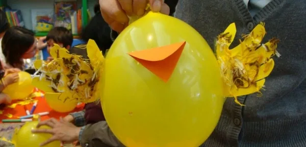 Bene gonfiatelo, attaccate un cartoncino triangolare arancione nella parte superiore e due zampette nella parte inferiore. Con del cartoncino giallo create delle mani e attaccatele sempre al palloncino. Otterrete così un fantastico pulcino pasquale. Con del tessuto infine potrete creare anche un semplice lavoretto colorato scrivendo sopra semplicemente 'Buona Pasqua' e potrete attaccarlo alla pancia del pulcino.