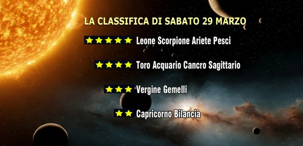 Per i quattro segni in cima alla classifica - Leone, Scorpione, Ariete e Pesci - si prospettano giornate eccellenti. Di contro, non sarà un inizio di weekend brillante per il Capricorno e la Bilancia, ai quali le previsioni zodiacali del 29 marzo riservano solo due stelline.