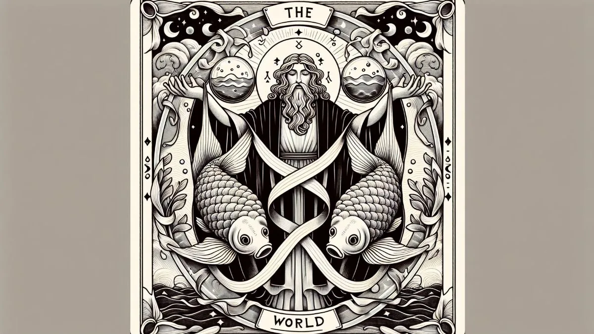Il simbolismo del Mondo si ritrova anche in diverse tradizioni culturali, dove il concetto di completamento e unità è caro. Nella filosofia cinese, il concetto di Yin e Yang rappresenta il perfetto equilibrio tra forze opposte, simboleggiando la chiusura di un ciclo e l'inizio di un altro. Allo stesso modo, nel mito del Serpente Ouroboros, presente in molte culture, si rappresenta un serpente che si morde la coda, simbolo di eternità e rinnovamento. Questi concetti ricordano ai Pesci l'importanza di accogliere ogni fase della vita come parte di un cerchio continuo.
