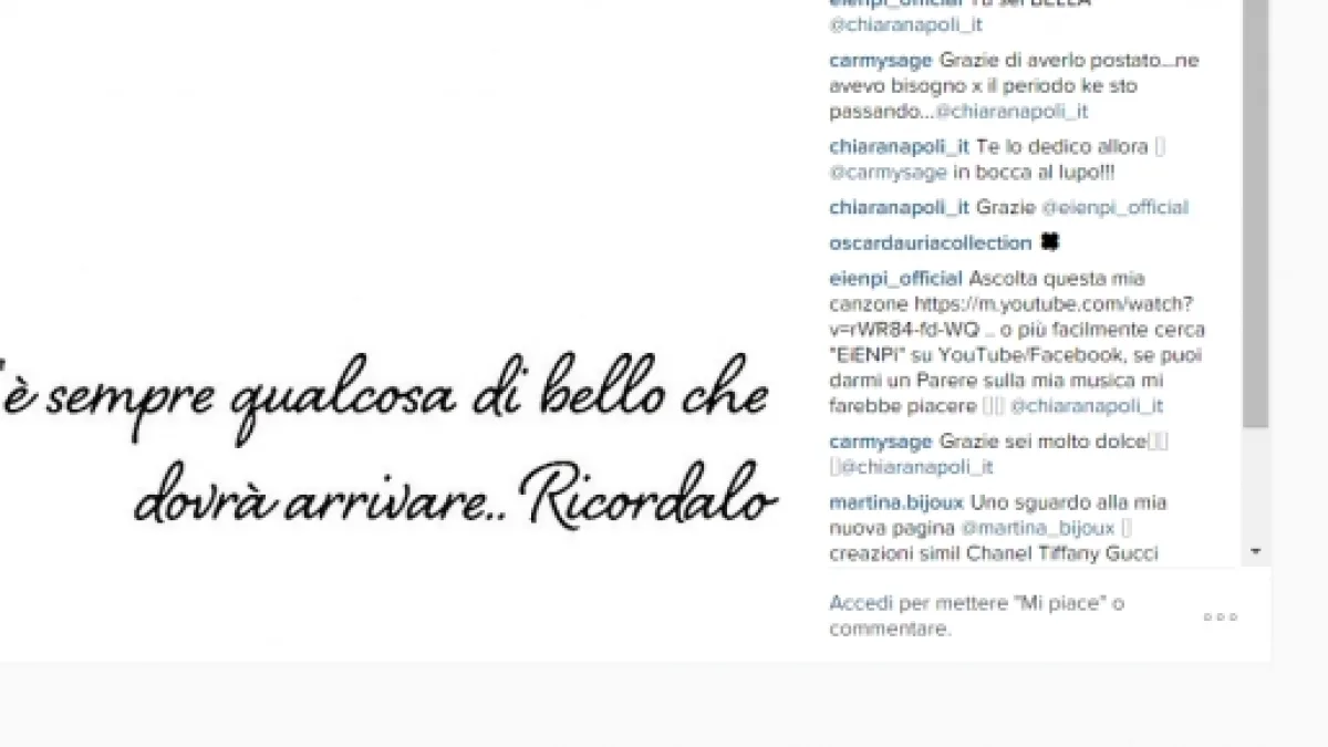 La frase di Chiara su Instagram - In allegato all'articolo potete visualizzare la frase che Chiara Napoli ha pubblicato su Instangram (abbiamo fatto uno screenshoot per meglio comprendere lo stato pubblicato): 'C'è sempre qualcosa di bello che dovrà arrivare..... Ricordalo'.
