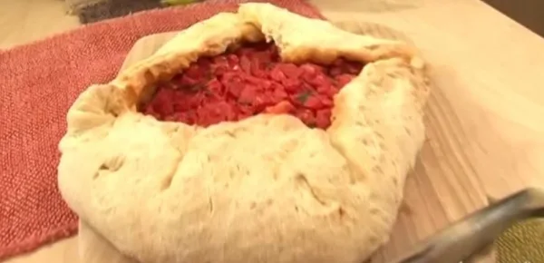 Passiamo quindi alle modalità di preparazione del secondo piatto del giorno di Cotto e Mangiato e che ha voluto omaggiare la tradizione sarda: in un bicchiere di acqua calda, sciogliamo il lievito di birra. Per la realizzazione dell'impasto ci serviamo dell'impastatrice nella quale aggiungiamo la farina, la semola ed a filo uniamo l'acqua con il lievito sciolto, quindi iniziamo a mescolare aggiungendo altra acqua tiepida e una volta realizzato il nostro impasto uniamo ancora il burro fuso. Completiamo unendo il sale e l'olio, prima di lasciar lievitare il nostro composto così realizzato per 2/3 ore. Nel frattempo eliminiamo la buccia ed i semi e tagliamo i pomodori che condiremo con un olio extravergine di oliva, sale, due spicchi d'aglio schiacciato e basilico tritato.