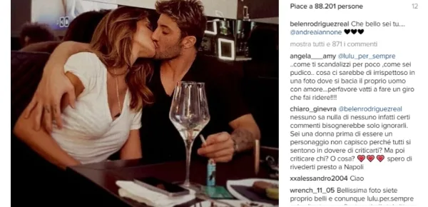 Belen Rodriguez ha più volte ribadito l'amore che prova nei confronti di Andrea Iannone e nelle ultime ore si è resa protagonista di una nuova foto dal contenuto romantico. I due mentre si baciano dopo una cena al ristorante. "Che bello sei tu, Andrea Iannone!" Sono queste riportate nella descrizione del post. I dubbi sorti in passato hanno trovato la pronta risposta dei due. La storia d'amore fra Belen e Andrea Iannone sembra andare liscia come l'olio, piena di momenti romantici e allegri.