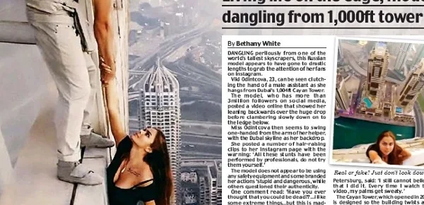 Con i suoi 300 metri d'altezza resta sicuramente un punto davvero inquietante per scatti fotografici, ma la bella Viki ha osato ancora di più lanciandosi prima indietro da un cornicione sorretta solo dalla mano di un assistente e successivamente calandosi giù dallo stesso, sempre aggrappata solo ad un braccio del collaboratore e priva di qualsiasi tipo di protezione.