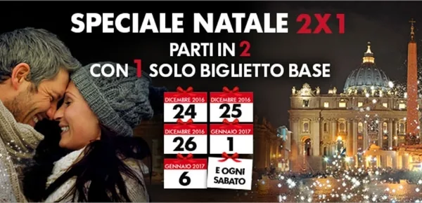 La società delle Ferrovie dello Stato ha introdotto lo ‘Speciale 2×1’ in edizione natalizia. La promozione consente di viaggiare in due, pagando un solo biglietto a tariffa Base, nei giorni della Vigilia (24/12), di Natale (15/12), di Santo Stefano (26/12), di Capodanno (1/01) e dell’Epifania (6/01). Ovviamente, tale offerta rimane valida per tutti i sabati.